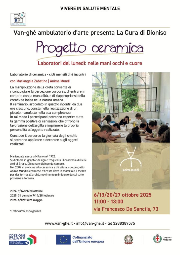 Un ciclo di laboratori di ceramica mensili (4 incontri) nell’ambito dell’iniziativa Milano 4 Mental Health, incentrati sulla manipolazione della creta per riscoprire la percezione corporea e la creatività.