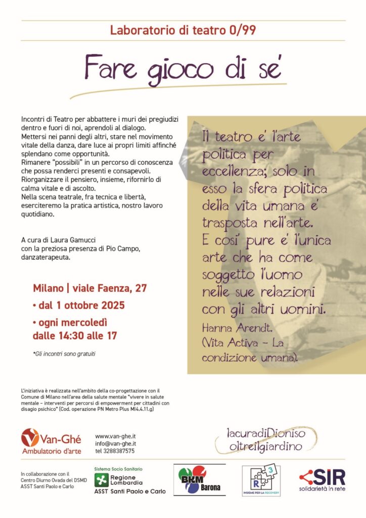 Un Laboratorio di Teatro 0/99 organizzato nell’ambito dell’iniziativa Milano 4 Mental Health per abbattere i pregiudizi e favorire il dialogo. L’iniziativa è realizzata in coprogettazione con il Comune di Milano e promossa dal sistema socio sanitario (ASST Santi Paolo e Carlo) con il supporto di varie cooperative e associazioni.